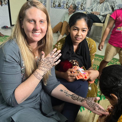 After time with the kids, the women started coming in for church service. They sang worship songs in Hindi which was so beautiful and then Jenn L. led us in a Bible lesson on the parable of the Sower. She brought a demonstration of the story done using henna and the visual was perfect for everyone to understand the message. She truly had a captivated audience. After the lesson, we were asked to pray and each of us had the privilege of praying for women and for their children. After prayer time, some of the young girls blessed us with Mindi. Jessika got one of the parable of the sower which Jenn had taught on, which was really special. Today was a beautiful day connecting with littles and lovely women of all ages, religions, and backgrounds. They touched our hearts so much and we are praying for them as we slowly start to prepare for our journey back to the States.